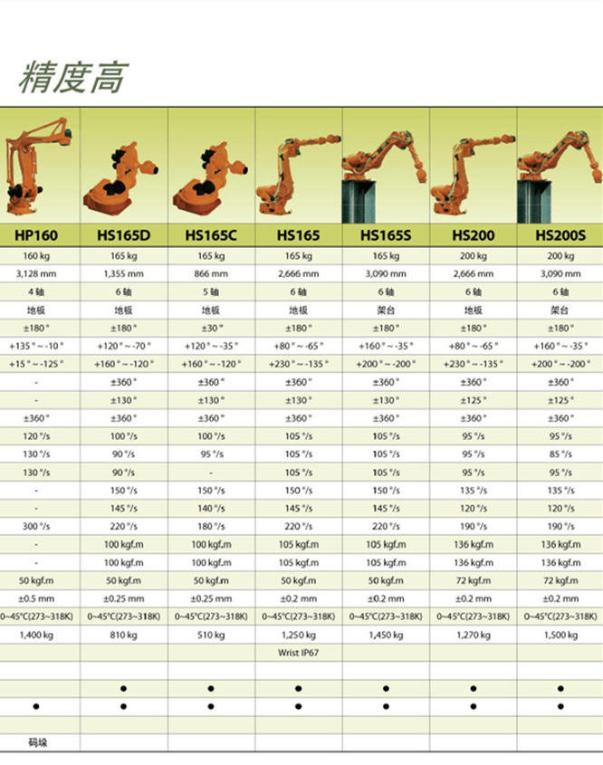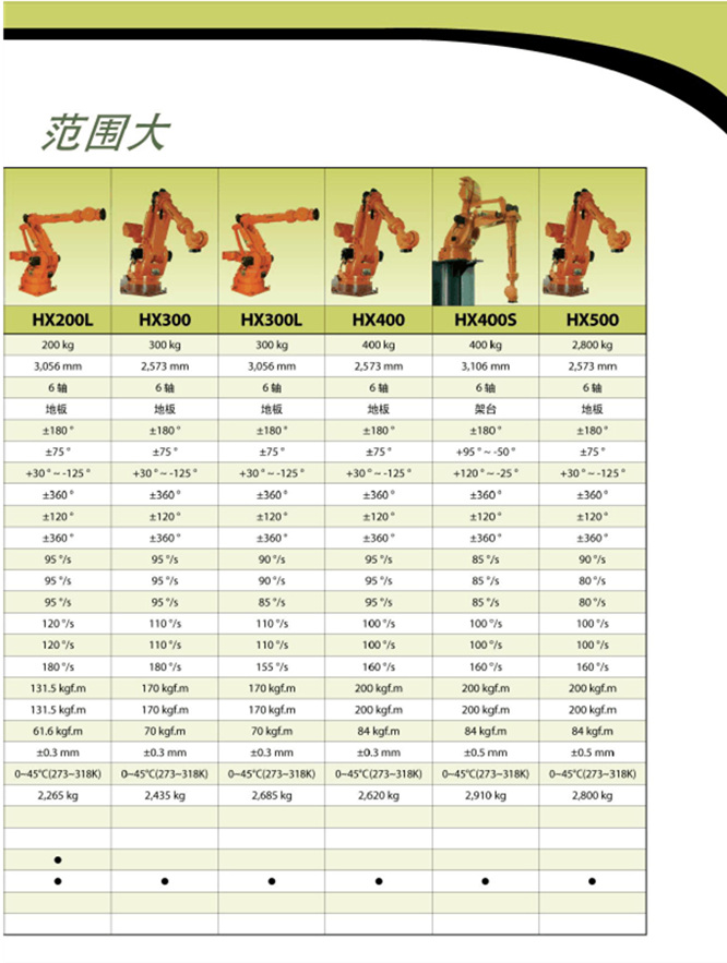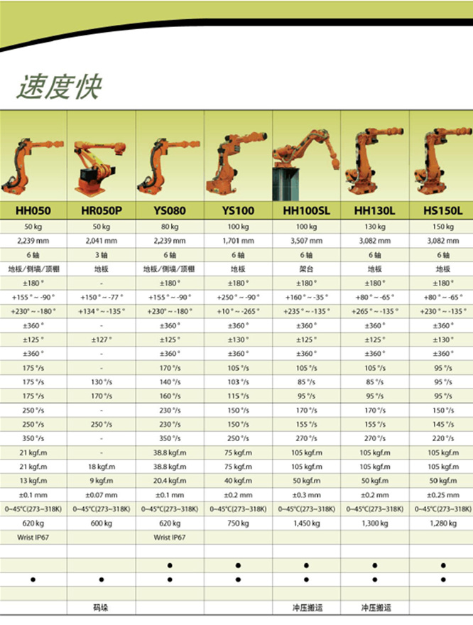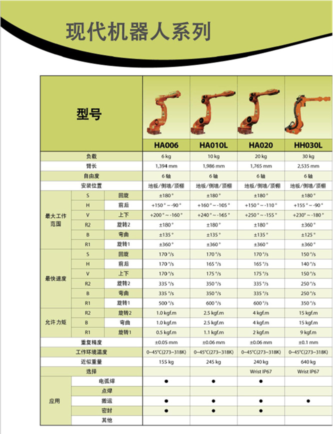 直角坐標型工業機器人 、 圓柱坐標型工業機器人、 圓柱坐標型工業機器人 、多關節型工業機器人、平面關節型工業機器人。弧焊機器人、 激光焊機器人、電阻焊機器人、自動化焊接機器人、點焊機器人、等離子切割機器人、清潔機器人、上料機器人、物料輸送機器人、材料去除機器人、包裝機器人、噴漆機器人、自動鉆孔機器人、堆跺機器人、涂層機器人、去毛刺機器人、磨銷機器人、高溫噴涂機器人等。